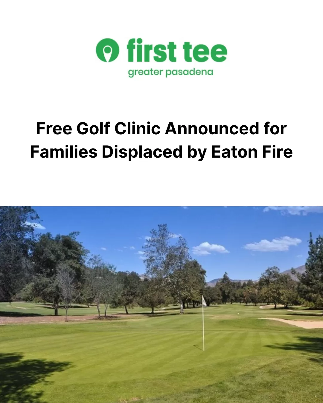 First Tee — Greater Pasadena will host a free family golf clinic to support families affected by the Eaton Fire, which destroyed more than 9,000 buildings and displaced hundreds.