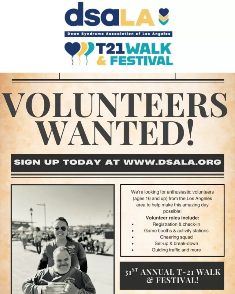 Down Syndrome Association Los Angeles is organizing DSALA’s 31st Annual T21 Walk & Festival and they need volunteers! To register to volunteer, go to their website www.dsala.org, click on T21 Walk, and then click on…